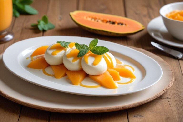 Tem uma memória afetiva muito forte na minha família envolvendo mamão papaia: toda vez que minha avó servia alguma coisa diferente com essa fruta, a mesa ficava em silêncio — o melhor silêncio, aquele de quem está completamente encantado com o que está comendo. Foi pensando nessa cena que criei esta Bavaroise de Papaia ao Creme de Iogurte e Mel, uma entrada elegante, leve e surpreendentemente fácil de preparar. O mamão papaia é uma fruta tropical riquíssima em vitaminas A e C, com textura naturalmente aveludada que se transforma em algo mágico quando combinada com gelatina e creme de leite. O resultado é uma mousse firme, delicada e perfumada, que derrete na boca. O creme de iogurte adoçado com mel finaliza o prato com uma acidez suave e um toque floral que equilibra perfeitamente a doçura da fruta. Sirva em forminhas individuais para um jantar especial ou em taças para um almoço de domingo diferente. Além de bonita na apresentação, essa receita é prática: você prepara com antecedência e deixa a geladeira fazer o trabalho pesado. Vamos juntos?