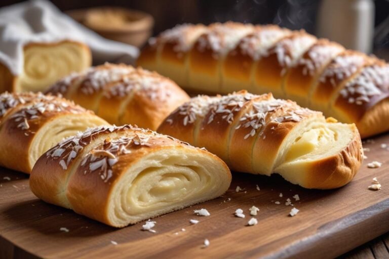 Tem memória mais gostosa do que cheiro de pão assando no forno da vovó numa tarde de domingo? As fatias húngaras são exatamente isso: um abraço quentinho em forma de receita. Apesar do nome sofisticado, esse pão recheado é um clássico da culinária popular brasileira — daquelas preparações que passam de geração em geração dentro de cadernos de receitas manchados de farinha. A massa é incrivelmente macia, levemente adocicada, e o recheio cremoso de coco transforma cada fatia numa verdadeira experiência. O fermento biológico é o segredo por trás dessa textura aerada e fofinha que a gente tanto ama — ele age na massa criando bolhinhas de gás que deixam o pão leve como uma nuvem. A técnica de enrolar como rocambole e cortar as fatias antes de assar é o que dá o visual característico e garante que cada pedaço absorva todo o sabor do recheio. Se você nunca fez pão caseiro antes, essa é a receita perfeita para começar: o processo é simples, os ingredientes são acessíveis e o resultado impressiona qualquer um que sentar à mesa. Prepare a sua e veja como a casa inteira vai se encher de um perfume irresistível!