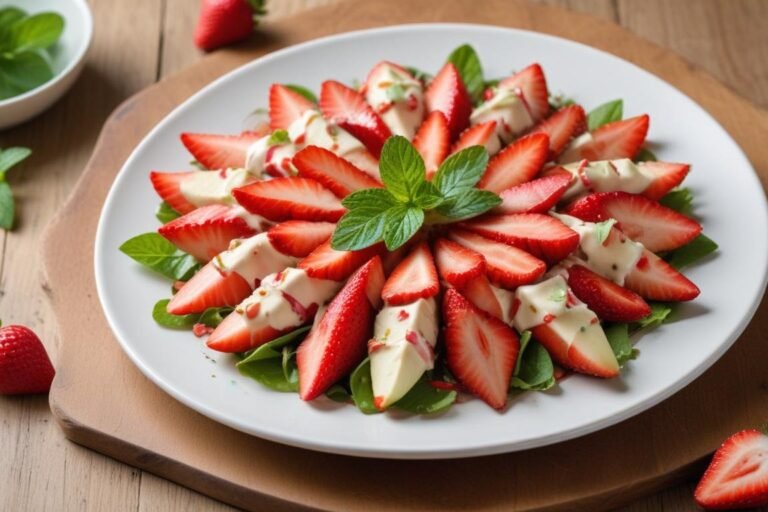 Tem dias em que a gente quer servir algo bonito, leve e diferente — sem passar horas na cozinha. Foi exatamente assim que essa Salada Chique de Hortelã entrou na minha vida: numa tarde em que os convidados chegaram mais cedo do que o esperado e eu precisava improvisar com o que tinha na geladeira. O resultado foi tão surpreendente que virou receita fixa nos meus encontros. A hortelã é uma erva aromática de origem mediterrânea amplamente usada na culinária brasileira, conhecida por refrescar qualquer preparo com seu aroma inconfundível. Aqui, ela estrela tanto no molho cremoso quanto na decoração final, dando um toque sofisticado que engana qualquer um — ninguém vai acreditar que levou menos de 15 minutos para ficar pronto. A combinação de palitos de kani com morangos frescos pode parecer ousada à primeira vista, mas é exatamente esse contraste entre o dulçor da fruta e a delicadeza do fruto do mar que torna o prato tão especial. O molho de maionese light com licor de menta amarra tudo com elegância. Perfeito para receber com estilo, servir como entrada ou até como um lanche sofisticado no dia a dia.